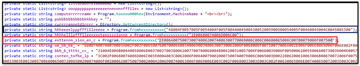 Figure 6 shows code extracted from the RikiRafael variant's binary, including several variables used throughout the program. The variables contain an unusual amount of characters, and the values of these variables are stored as hexadecimal (HEX) values (see Figures 7 and 8). This style of coding is often described as obfuscation and is used to hide a program's true intent from security tools and analysts. The ASCII representation of the HEX value in Figure 7 is HOW_TO_DECRYPT_FILES, and the ASCII representation of Figure 8 is .justbtcwillhelpyou.