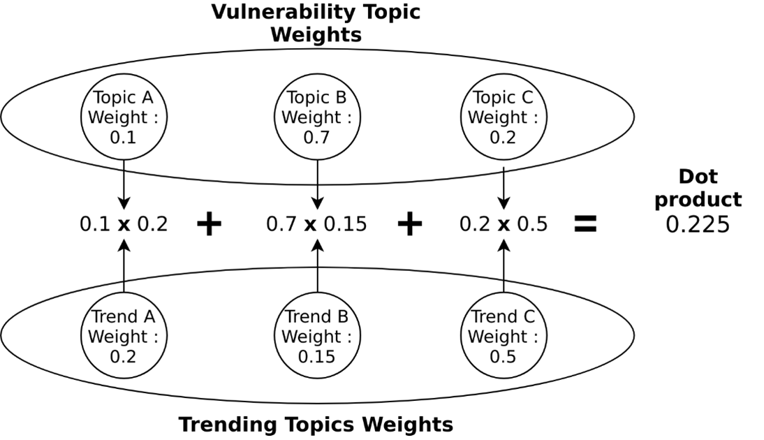 Finally, we look back at the vulnerabilities from the NIST database which were used to build the initial topic model, and identify the ones with topics matching the newly established trends. This is done by applying the dot product to each vulnerability topic vector and the trends vector, or in slightly more human language, by computing the product of each of a vulnerability’s topic weights and its corresponding trend weights, and summing them. This provides a final Vulnerability Trends Score (VTS).