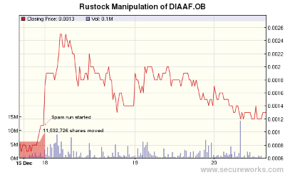 So, at close on Friday, December 15, the stock is at $0.0011. Suddenly, the Rustock botnet begins spewing out the spam shown above. All weekend it churns away, sending millions of emails. Monday morning, December 18, sees the stock immediately rise to $0.0019 a share, then all the way to $0.0025 a share, as some recipients of the spam begin to purchase the stock. A far cry from the spammer's target of $0.02 a share, but lets see how much that adds up to. If the spammer sells his shares early on Monday, when the stock has peaked, those 11,532,726 shares could be worth nearly $29,000, leaving the spammer with a cool $20K profit for one weekend. I wonder if the spams touting Viagra and Rolexes have ever made that much profit so quickly for the spammers with so little effort and almost zero overhead. It's little wonder why stock spam is taking over.