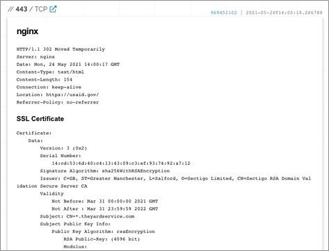 Analysis of the theyardservice . com domain revealed multiple URLs containing the “usaid” subdomain, a reference to the United States Agency for International Development (USAID). Shodan historical records for 83 . 171 . 237 . 173 show redirects to USAID's main website at https: //usaid . gov on port 443 (see Figure 2). This activity is likely part of a USAID-themed phishing campaign.