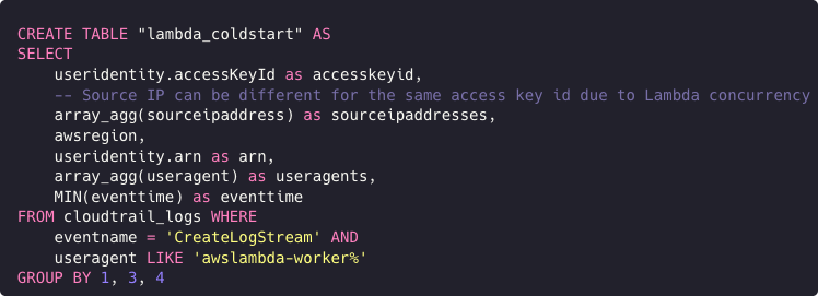 FROM cloudtrail_logs ct, lambda_coldstart lcs WHERE