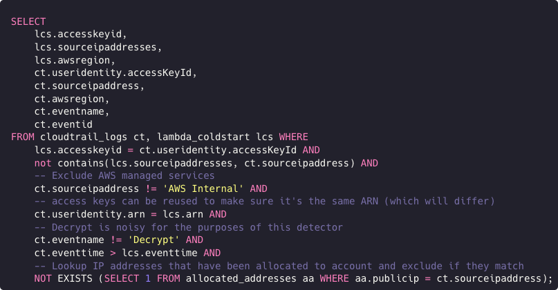 To determine if credentials have been exfiltrated or used outside the standard Lambda execution, a query is run against all CloudTrail events. It looks for events where the access key ID exist in the baseline Lambda events table and where the following criteria is met: