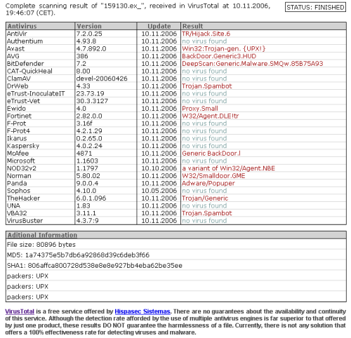 Note that the current incarnation is not called SpamThru by any vendor who detects it in the above scan result from VirusTotal, however, by correlating behavior with previous writeups, it is apparent that it is the same trojan. Given that SpamThru is the most descriptive and unique name assigned to it, we have chosen to call it that in this writeup as well. Overall, detection by AV vendors is sparse, but that's to be expected given that SpamThru is a money-making operation, and the author takes great care to make sure that detection by the major vendors is avoided by frequently updating the code.