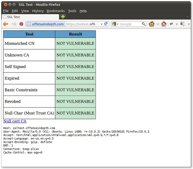 Figure 9 shows a sample visit from a typical installation of Firefox 10.0.2 on Linux directly to the test page. In this case, there is no SSL interception proxy in use, so no vulnerabilities are shown.